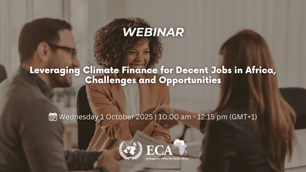 ينظم مكتب اللجنة الاقتصادية لأفريقيا في شمال أفريقيا الندوة الإلكترونية بعنوان “الاستفادة من تمويل المناخ لتوفير وظائف لائقة في أفريقيا: التحديات والفرص”، والتي تعقد عن بعد يوم ١ أكتوبر ٢٠٢٥، من الساعة ١٠:٠٠ صباحًا إلى ١٢:١٥ ظهرًا (بتوقيت غرينتش +١)، عبر الإنترنت (Zoom)، مع توفير الترجمة الفورية: الفرنسية والإنجليزية.