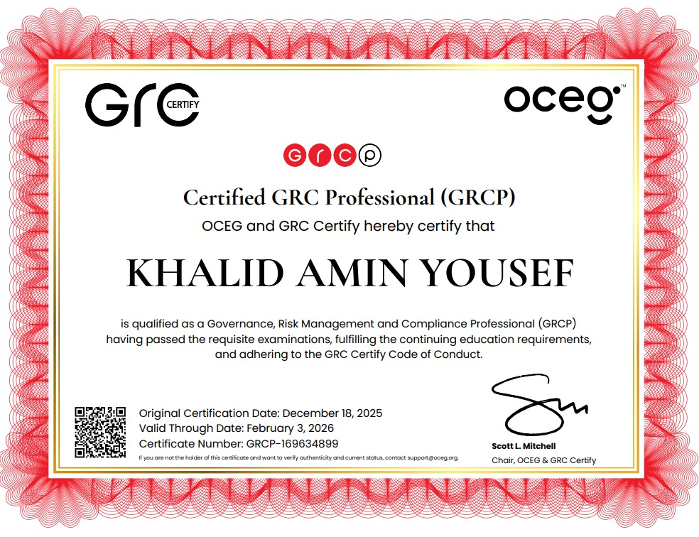 حصل المحامي الدكتور خالد أمين يوسف على شهادة اخصائي معتمد في الحوكمة وإدارة المخاطر والامتثال (GRCP) من قبل جمعية الامتثال والأخلاقيات المؤسسية (OCEG)، والتي تعد واحدة من أكثر البرامج الاحترافية شمولاً وحداثة في مجال الامتثال وأخلاقيات العمل.