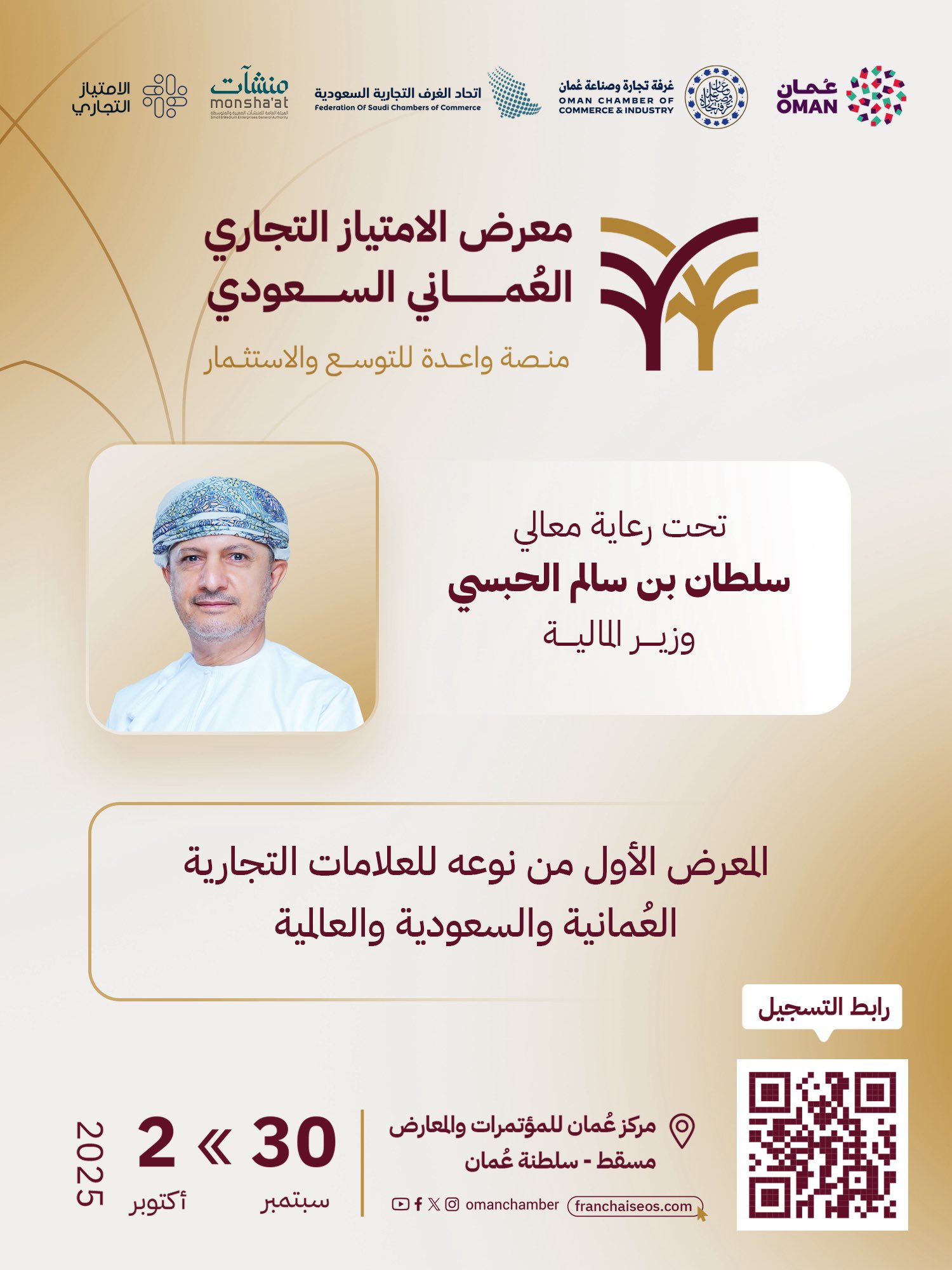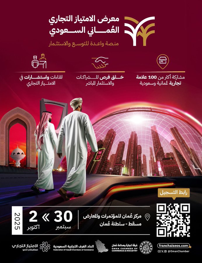تحت رعاية معالي وزير المالية العُماني سلطان بن سالم الحبسي؛ تنطلق فعاليات معرض الامتياز التجاري العُماني السعودي الذي ينظمه اتحاد الغرف السعودية ممثلاً بمجلس الأعمال السعودي العُماني وغرفة تجارة وصناعة عُمان ، وذلك خلال الفترة من 30 سبتمبر وحتى 2 أكتوبر م؛ 2025 بمركز عُمان للمعارض والمؤتمرات بالعاصمة العمانية مسقط.
