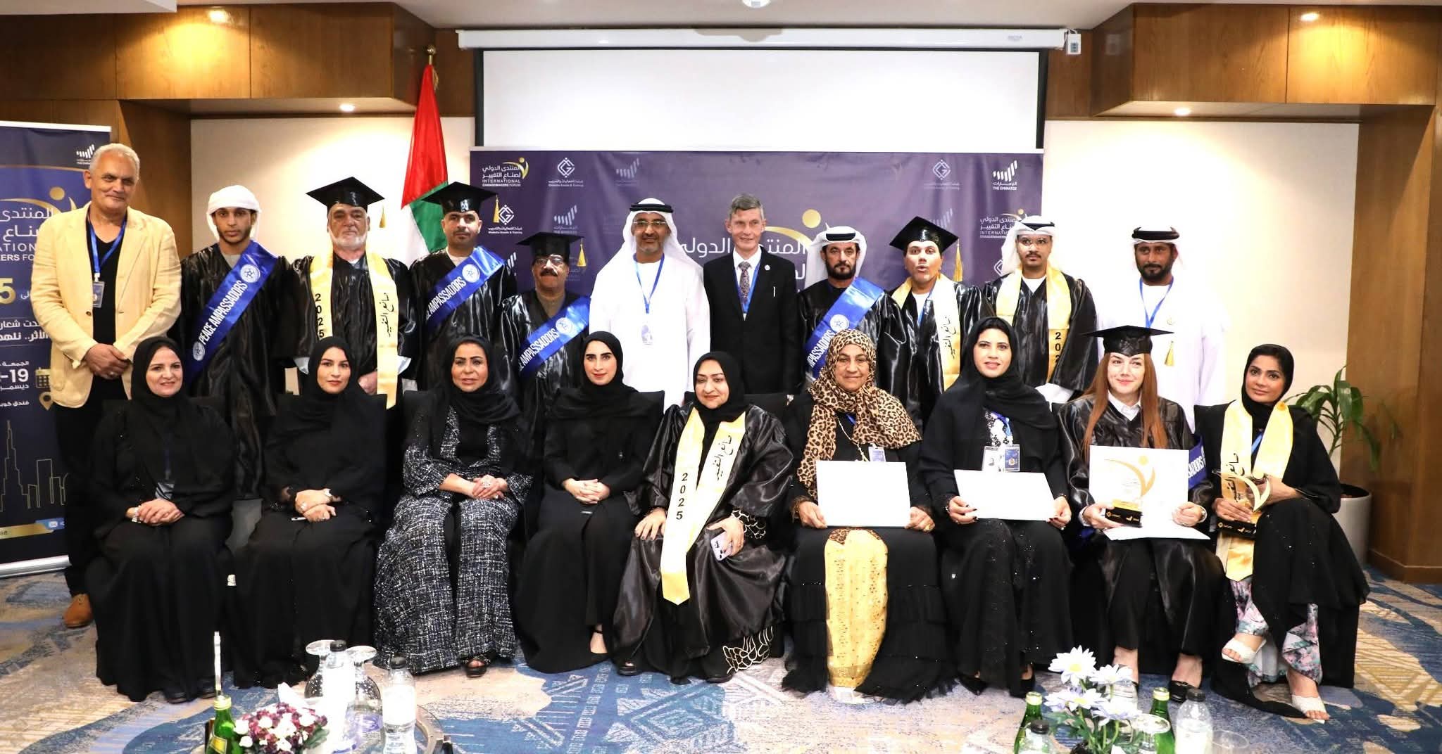 وفي ختام المنتدى، جرى تتويج عشر شخصيات عربية بلقب “صانع التغيير 2025″، بالإضافة إلى شهادة الدكتوراه الفخرية من جامعة إكسفورد الدولية ولقب سفير السلام الدولي من مجلس سفراء السلام بالمملكة المتحدة، وذلك تقديرًا لإسهاماتهم النوعية في مجالات التعليم والإعلام والثقافة والفنون والعمل الإنساني والعلاج النفسي، وهم: الدكتور سالم علي اليليلي، والدكتور علي الشالوبي، والأديبة أسماء الزرعوني، والأخصائي النفسي بطي عيسى حسن، وراوية قمقوم، والدكتور محمد عبد الله الوالي، وعبير نحاس، وعلي سيف الشامسي، وفرحان الخوري، والإعلامي علاء سلامة.