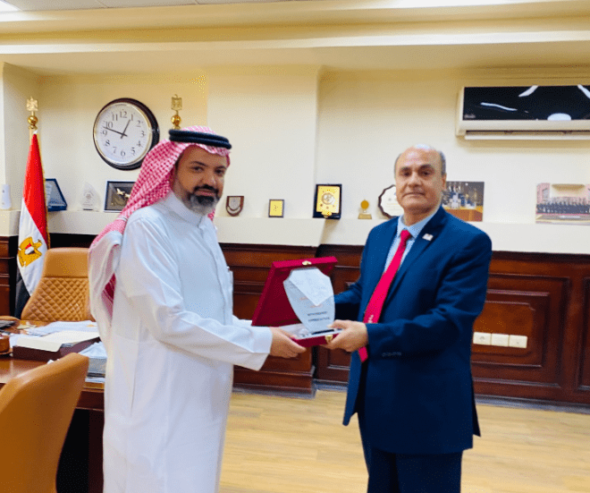وفي ختام اللقاء، قدّم الأستاذ الدكتور طارق عبد الملاك درعًا تذكاريًا إلى السيد خالد محمد الغامدي تقديرًا لزيارته وتأكيدًا على عمق العلاقات بين الجانبين.